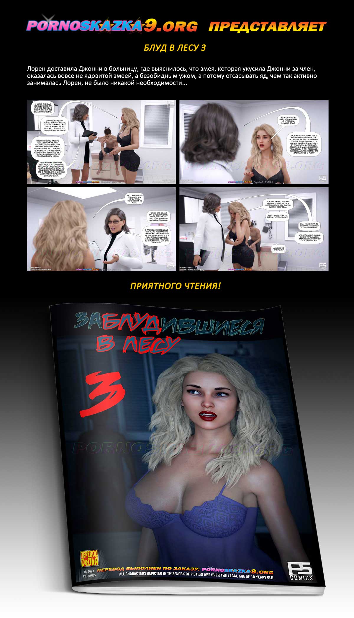Порно комикс «Блуд в лесу. Часть 3.» Лорен доставила Джонни в больницу, где выяснилось, что змея, которая укусила Джонни за член, оказалась вовсе не ядовитой змеей, а безобидным ужом, а потому отсасывать яд, чем так активно занималась Лорен, не было никакой необходимости…